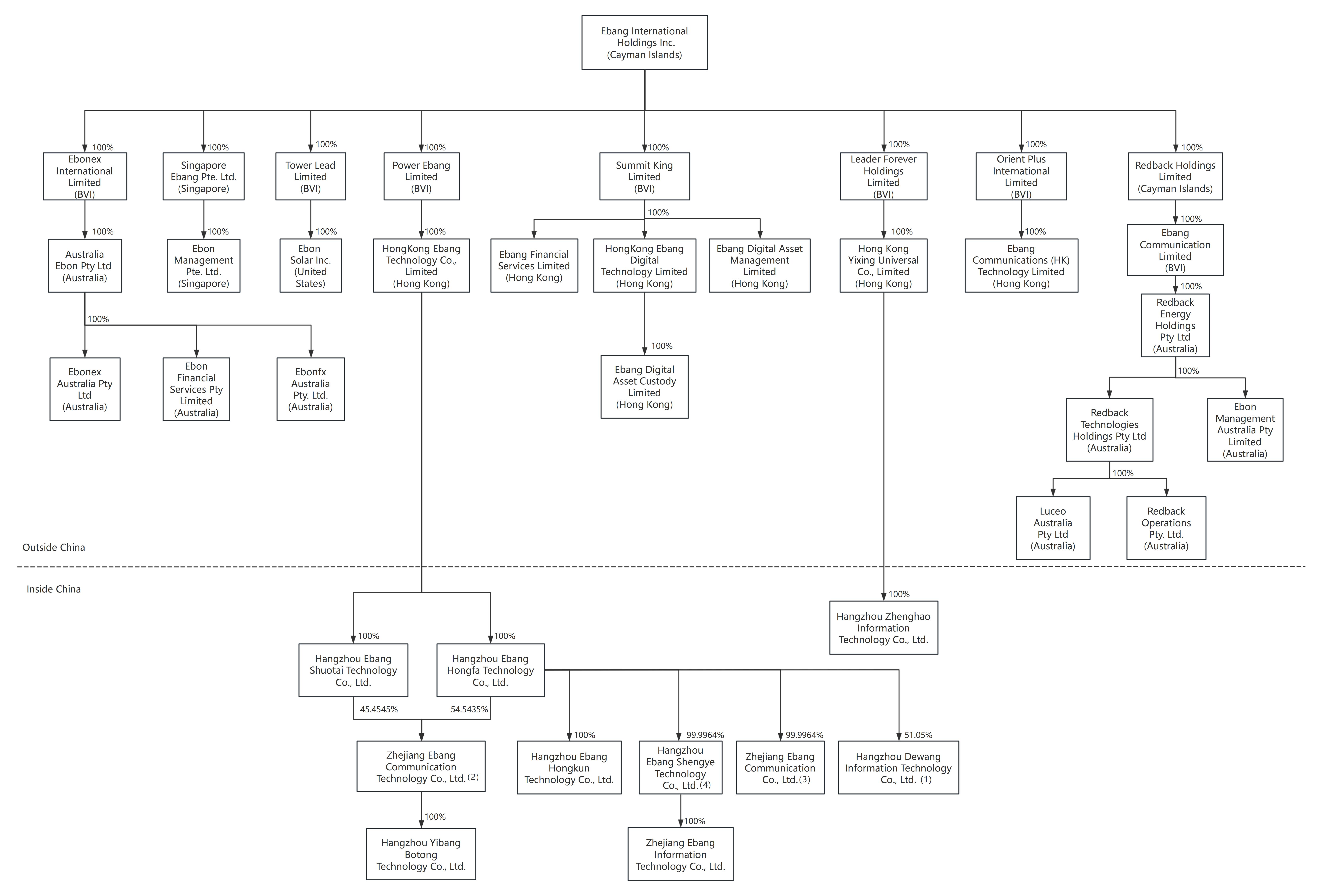 | ● | “operating subsidiaries” means, for the purpose of this annual report, primarily, PRC operating subsidiaries, Ebonex Australia Pty Ltd (“Ebonex Australia”), Ebon Management Australia Pty Limited (“Ebon Management Australia”), Ebonfx Australia Pty Ltd (formerly known as Compass Global Holdings Pty Ltd) (“Ebonfx Australia”), Ebon Financial Services Pty Limited (“Ebon Financial Services”), Redback Technologies Holdings Pty Ltd (“Redback Technologies”), Redback Operations Pty Ltd (“Redback Operations”), Luceo Australia Pty Ltd (“Luceo Australia”), Ebang Communications (HK) Technology Limited (formerly known as Hong Kong Bite Co., Limited) (“HK Ebang Communications”), HongKong Ebang Digital Technology Limited (“HK Ebang Digital”), Ebon Management Pte. Ltd. (“Ebon Management”), and Ebon Solar Inc. (“Ebon Solar”); |